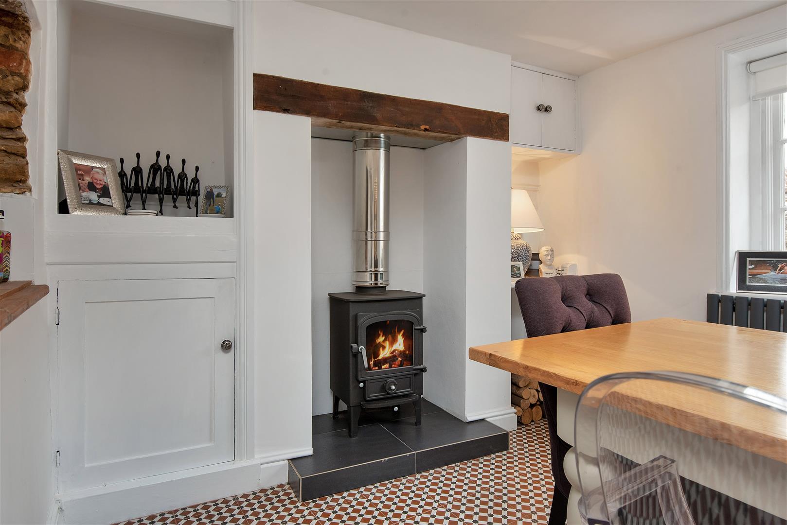 A Clearview wood burning stove sits on an exposed brick hearth with oak beam over, providing a great focal point to the charming room.