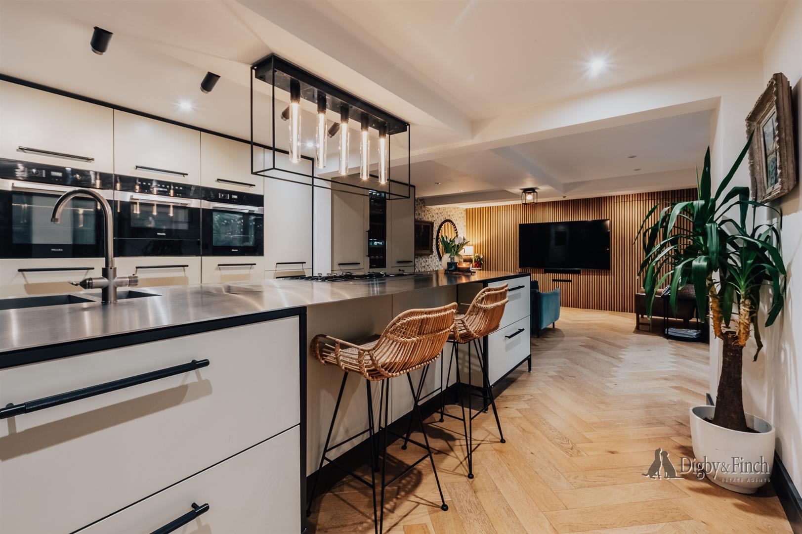 Moving beyond the hallway, the heart of the home is revealed in the superb live-in kitchen. A substantial peninsular island and full-height bespoke cabinetry are complemented by a comprehensive range of premium appliances, including two Miele multifunction ovens and a microwave, a large gas hob with pop-up extractor, dishwasher, full-height fridge and freezer, and a Liebherr wine chiller. Stainless steel work surfaces with seamless double inset sinks and a boiling water tap enhance both the aesthetic and functionality, while breakfast bar seating provides an informal dining option.
