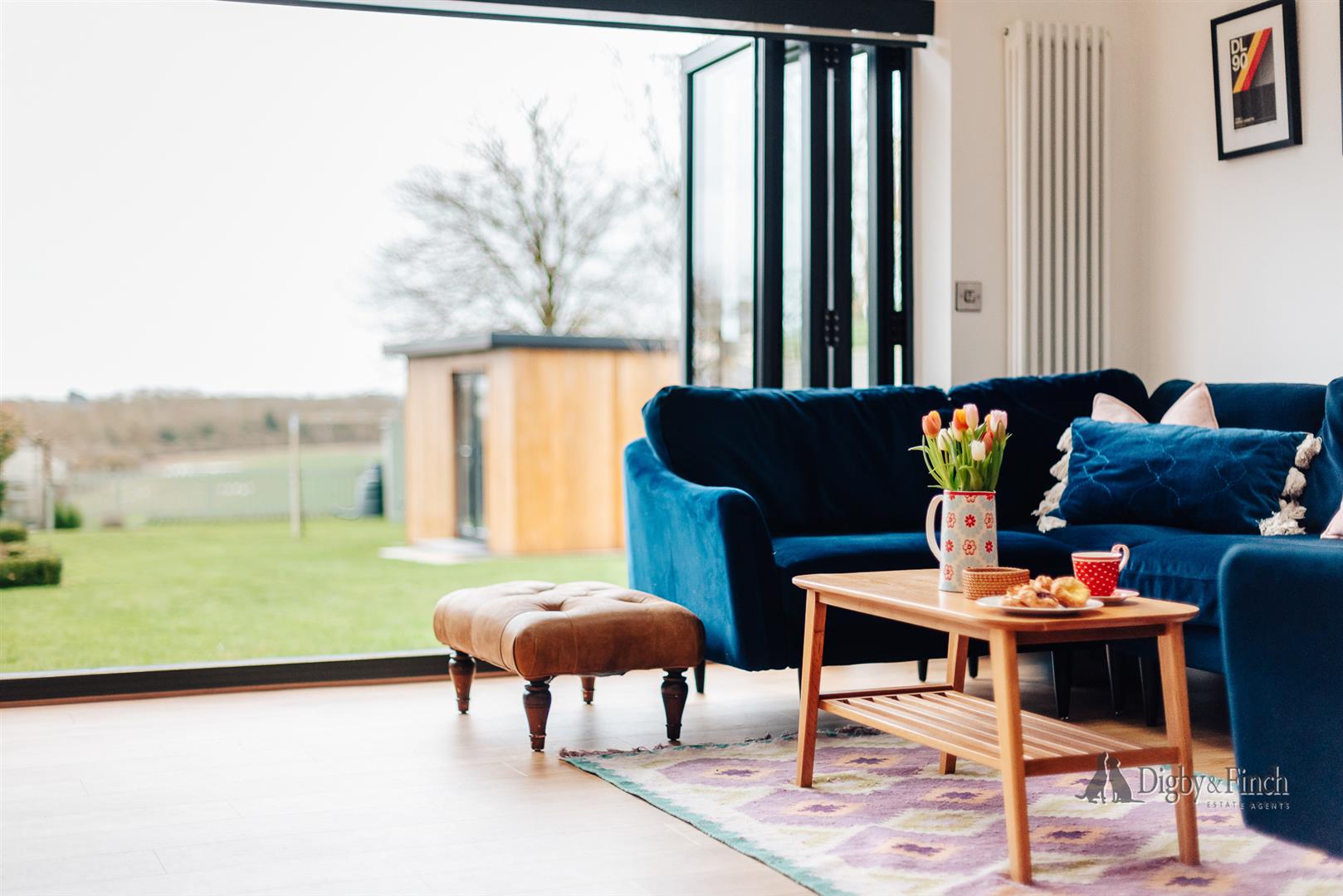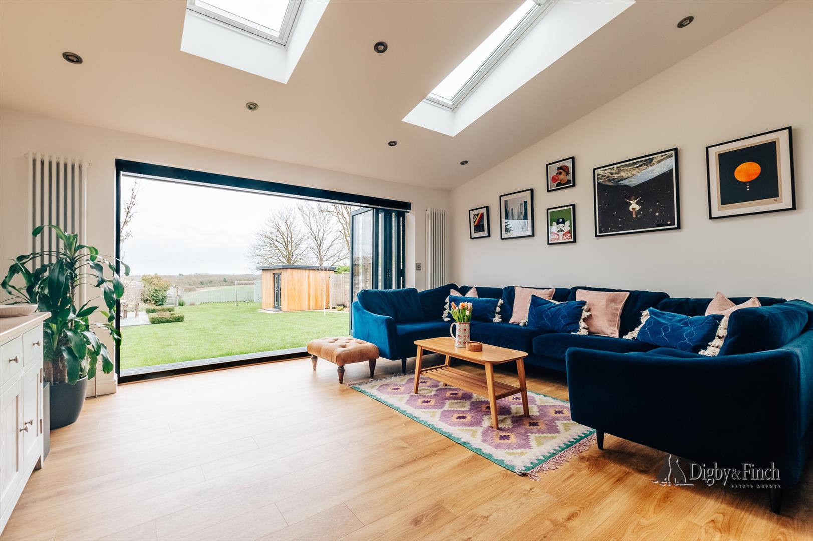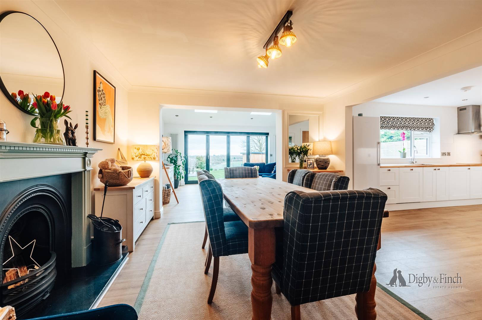 The dining area provides generous room for a large table and is centred around a charming fireplace, creating a lovely focal point and a natural space for entertaining. Flowing seamlessly from here is the relaxed seating area, positioned to enjoy views of the garden and open countryside beyond. With the bi-fold doors open in the warmer months, inside and out become effortlessly connected — a wonderful setting for summer evenings and relaxed weekends alike.