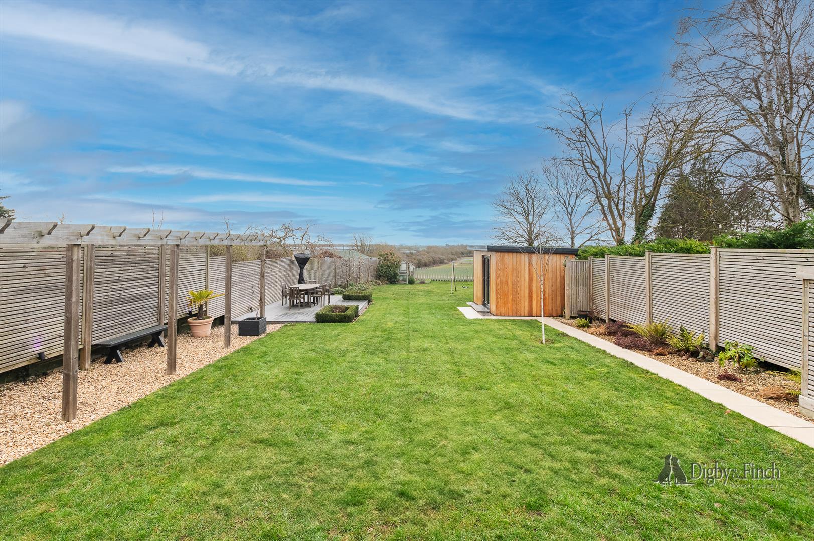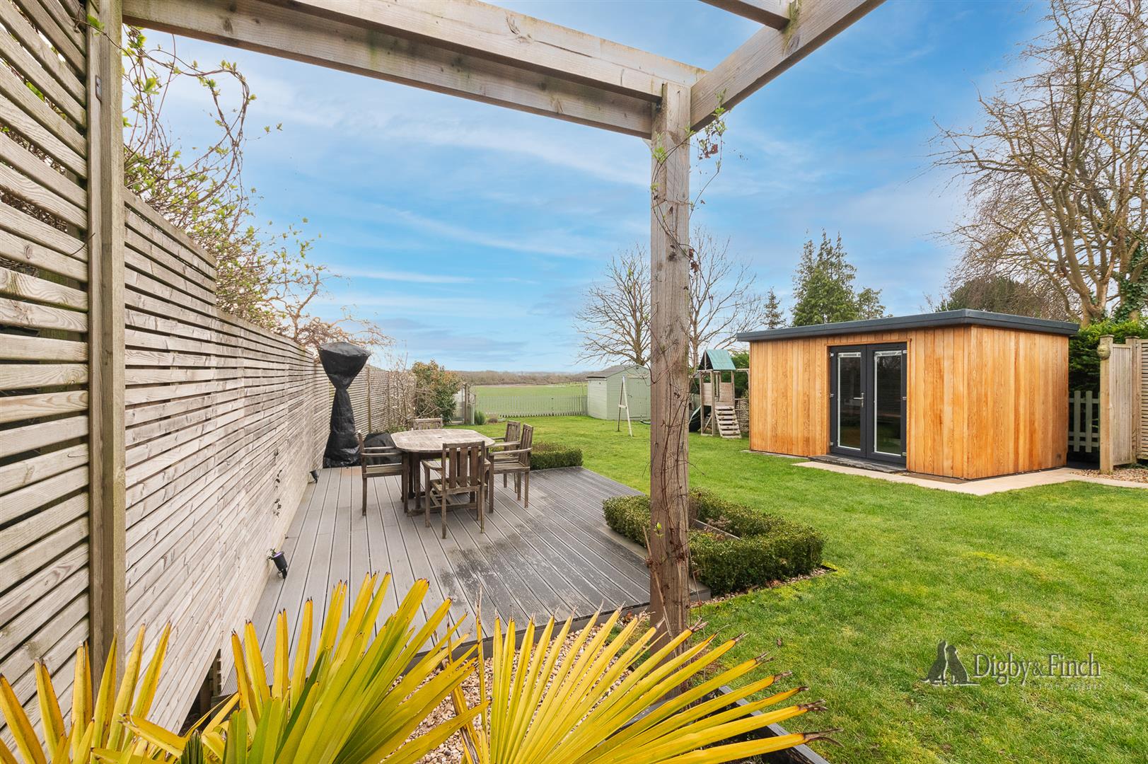 The rear garden is a true highlight — enclosed and private, with a generous composite decked terrace and a variety of seating areas thoughtfully arranged to take full advantage of the delightful views across open farmland.
