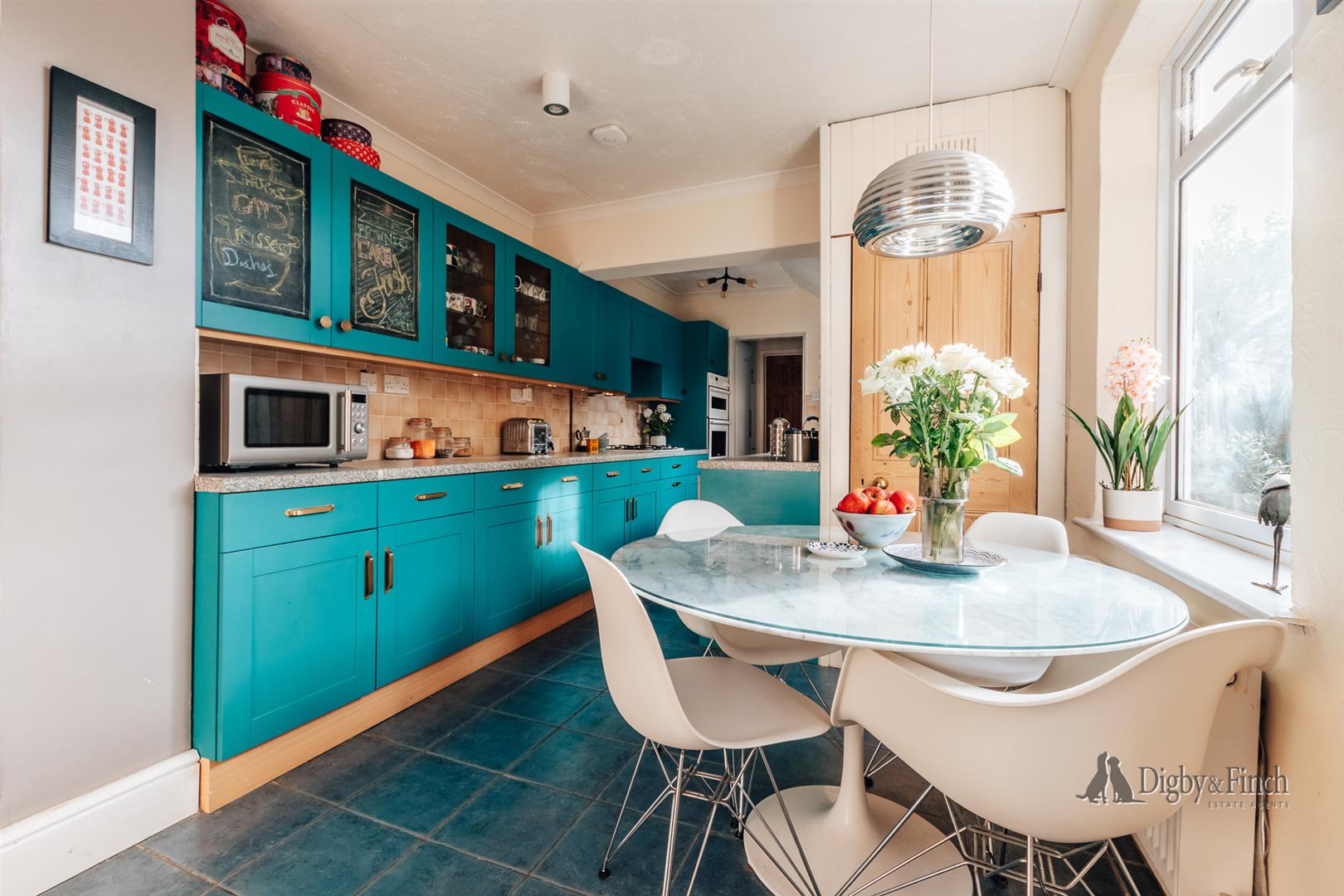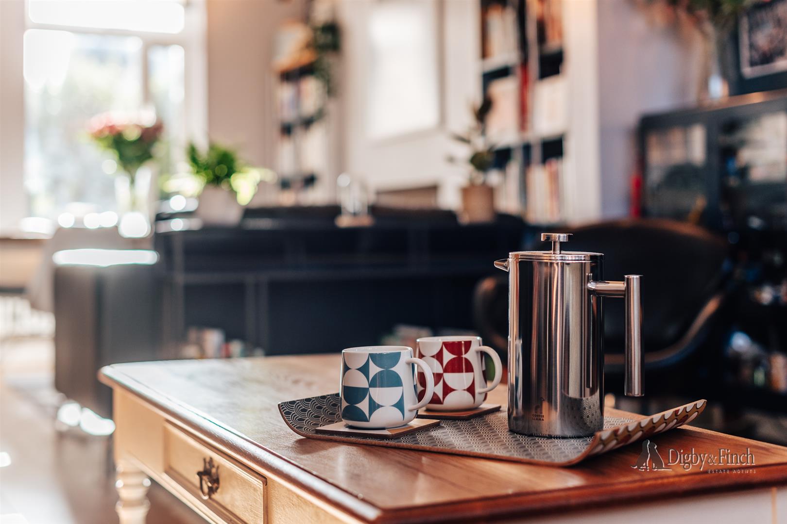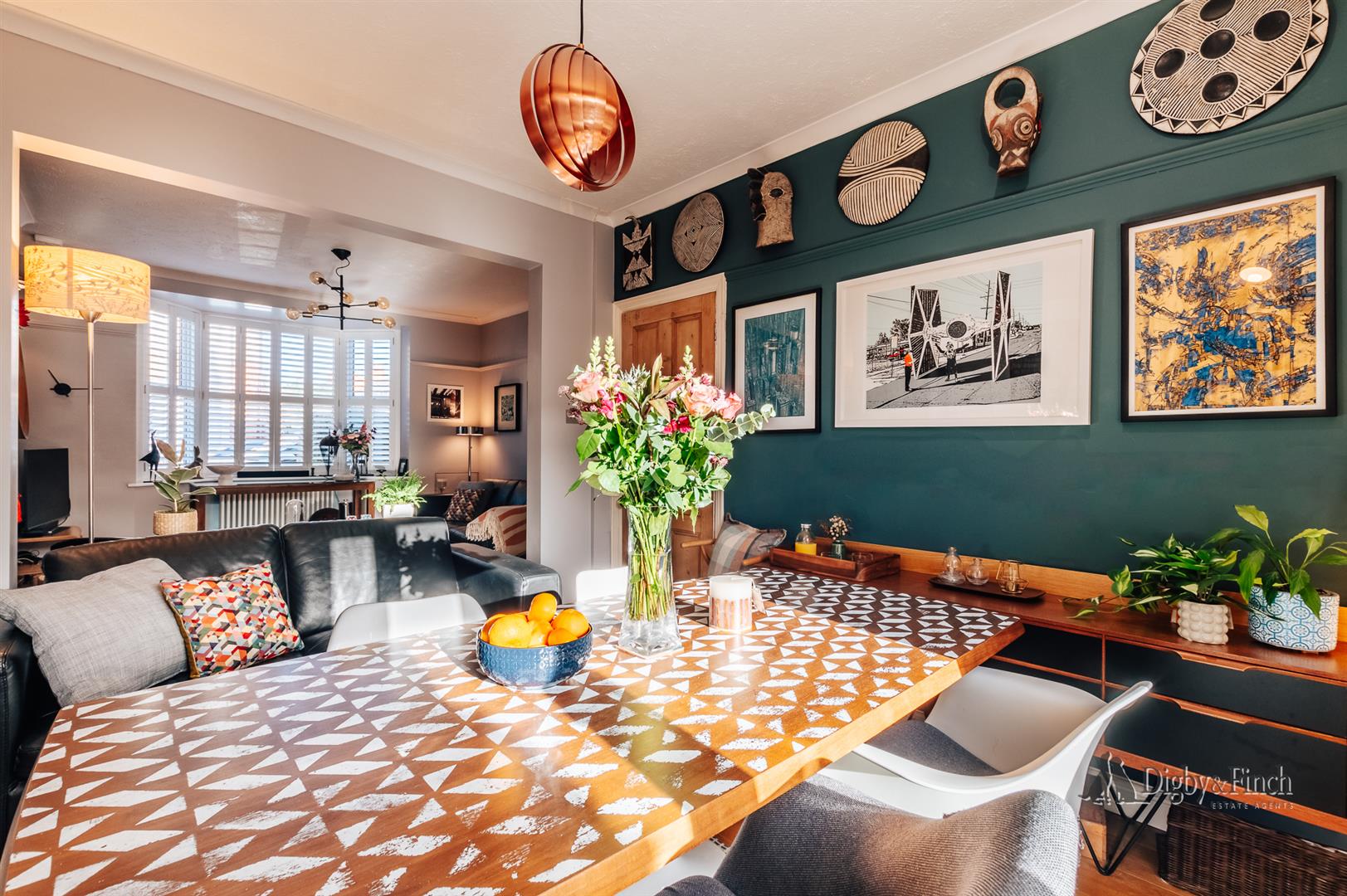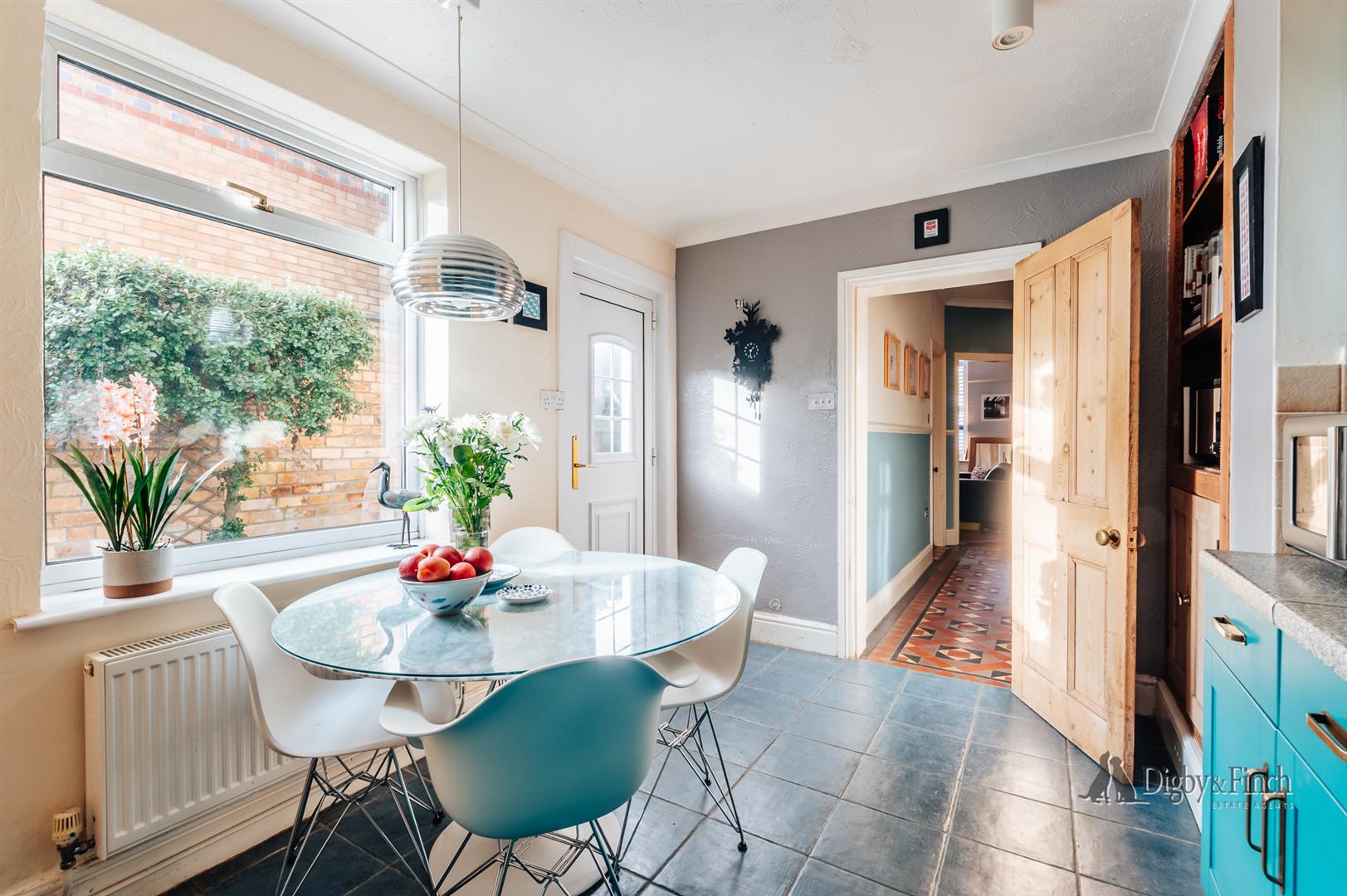 The property offers two inviting reception rooms, thoughtfully opened up to enhance natural light and create an impressive sense of space. The sitting room features a wood-burning stove with attractive contemporary tiling, providing a wonderful focal point, while the bay window fitted with plantation shutters adds both charm and practicality. The second reception room, currently used as a dining room enjoys a lovely outlook over the south-facing courtyard garden.